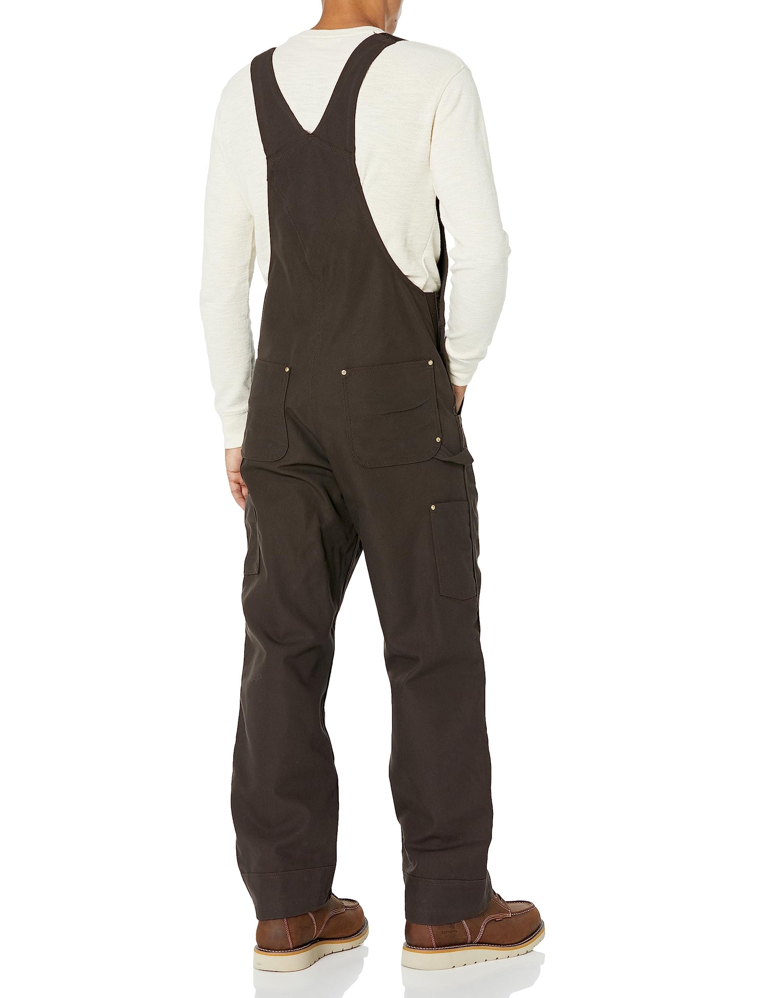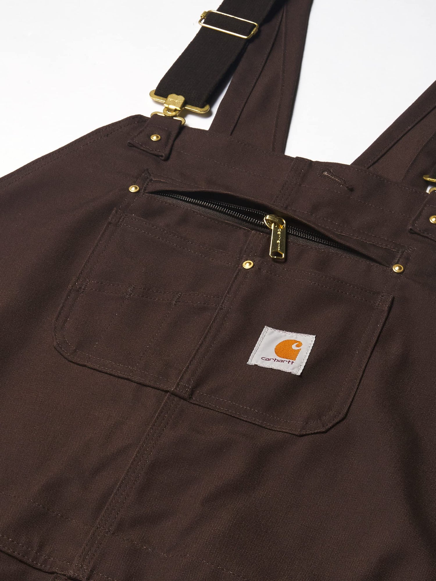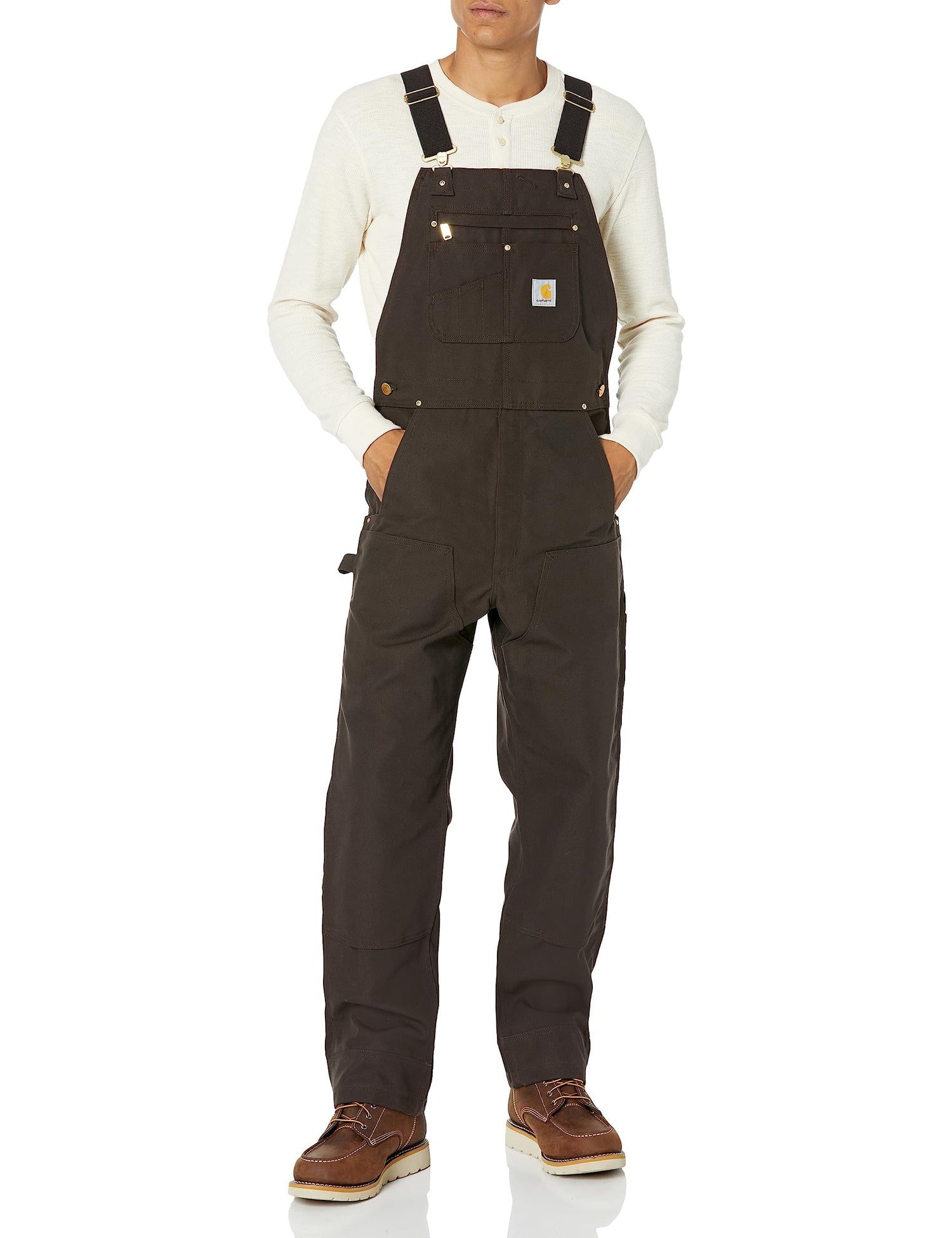 The updated version of Carhartt classic R01 bib was built with feedback from Carhartt consumers. 12-ounce, 100 percent ring-spun cotton duck adjustable front-elastic suspenders bib pocket with zipper closure holds electronics securely two additional storage pockets; one with pen stall stretch side panels for comfort any day more precise fit zipper fly two large lower-front ledge pockets right-leg hammer loop long-wearing, chap-style double-front construction with cleanout bottoms that can accommodate knee pads two reinforced back pockets 360 kick-panel triple-stitched main seams for durability metal rivets at vital stress points imported