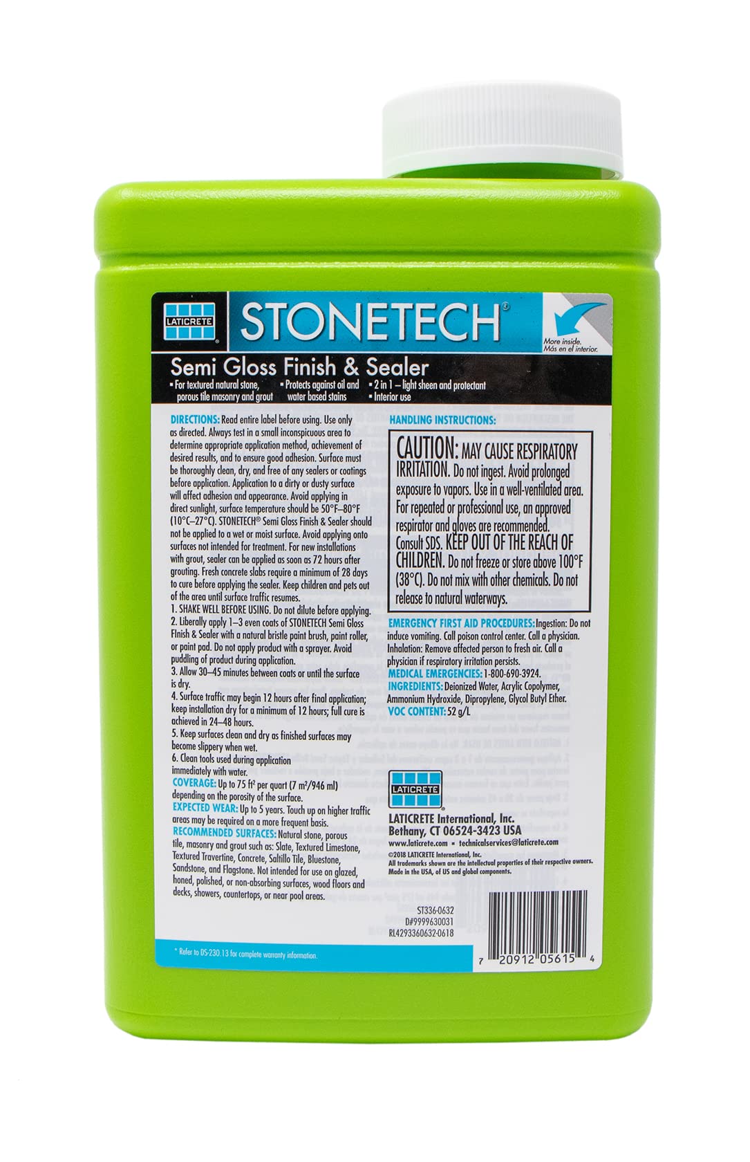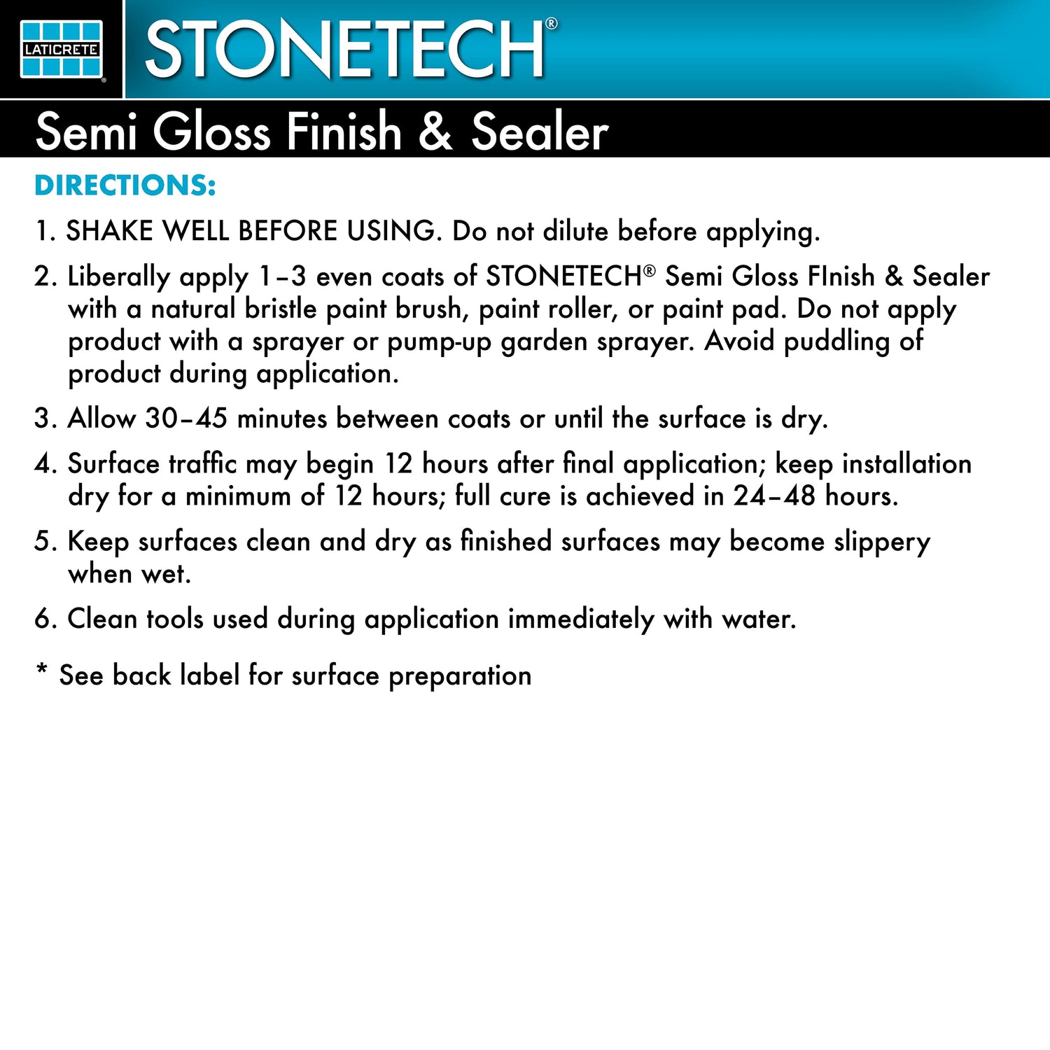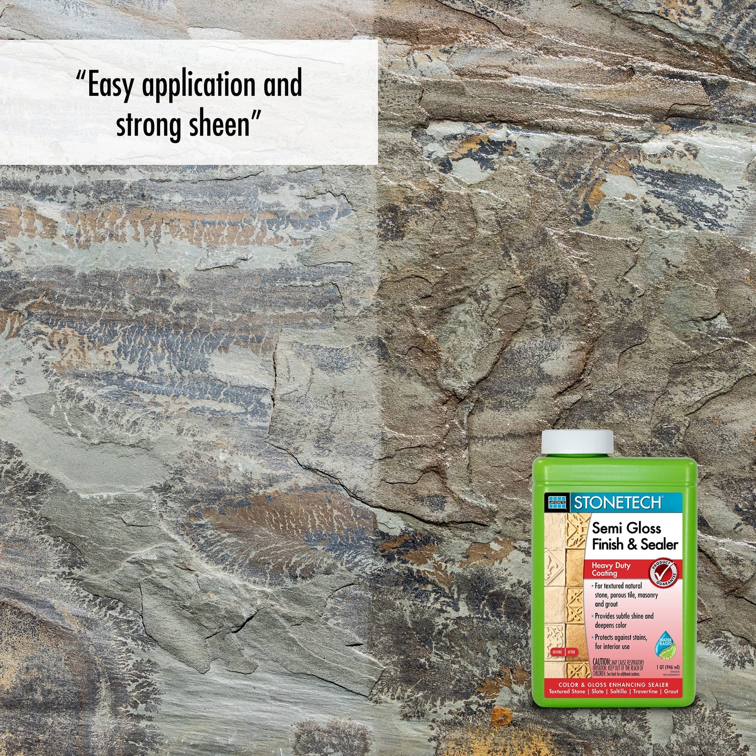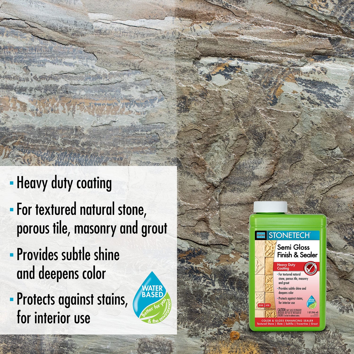 STONETECH Semi Gloss Finish & Sealer is a water-based, enhancing sealer that leaves a semi gloss, heavy duty coating on textured stone, porous tile, masonry and grout. It protects interior surfaces against stains and transforms the look by adding a subtle shine and deepening the natural color.