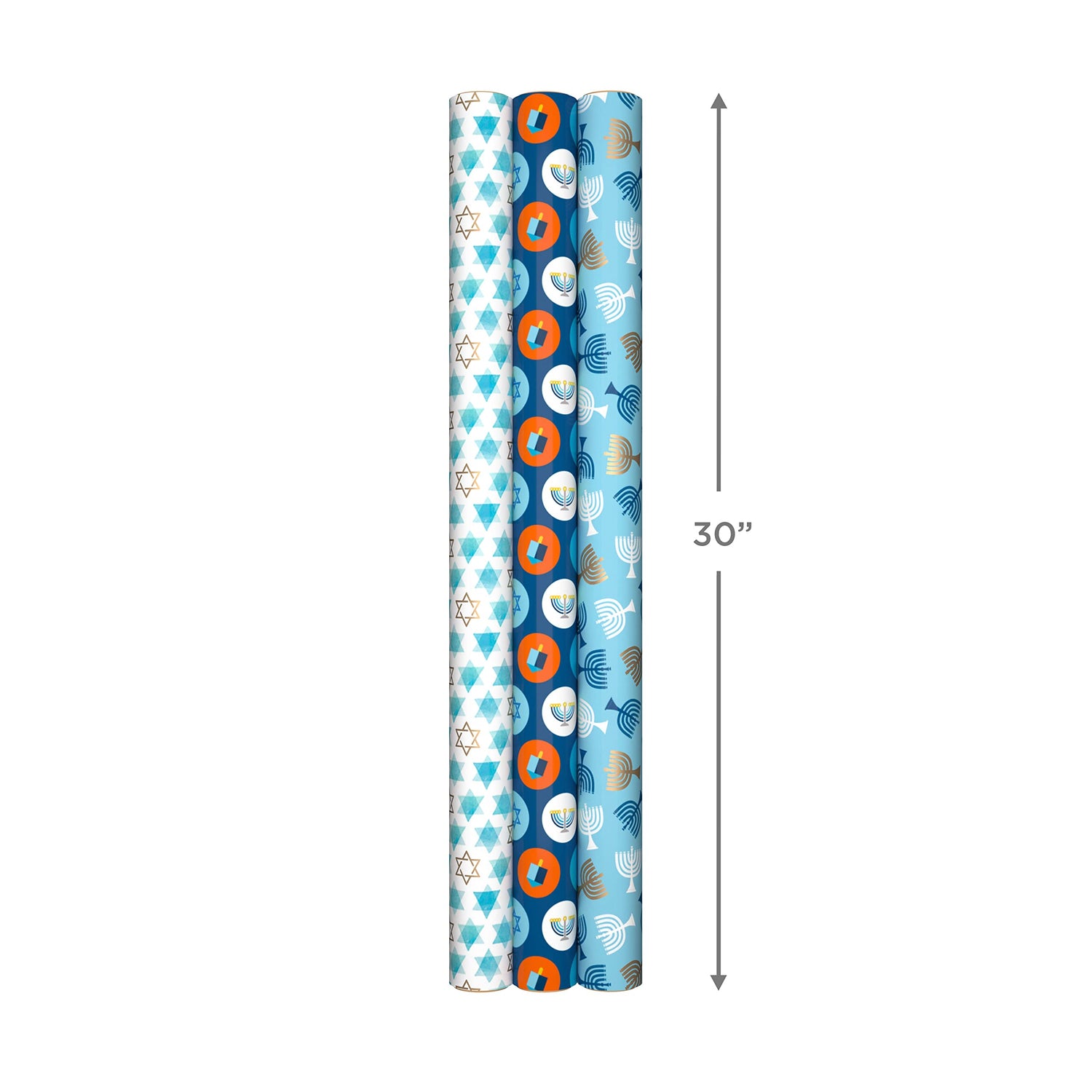• 120 SQUARE FEET: Each roll in this 3-pack of Hanukkah gift wrap measures 30 inches wide by 16 feet long for a total of 40 square feet per roll; 120 square feet total in the set