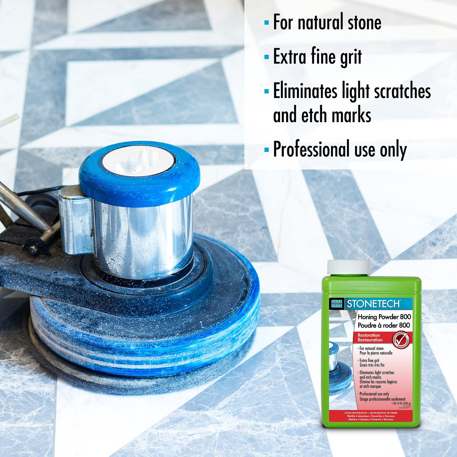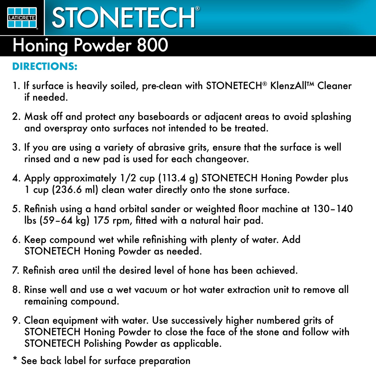 STONETECH Honing Powders are stone restoration powders that eliminate mild to deep scratches and create even honed, flat finishes. These powders are available in extra fine to coarse grits (180, 280, 400, 600, and 800). These non-acidic powders are designed for professional use on natural stone and terrazzo surfaces.STONETECH honing powders prepare the surface for polishing with STONETECH Polishing Powder.