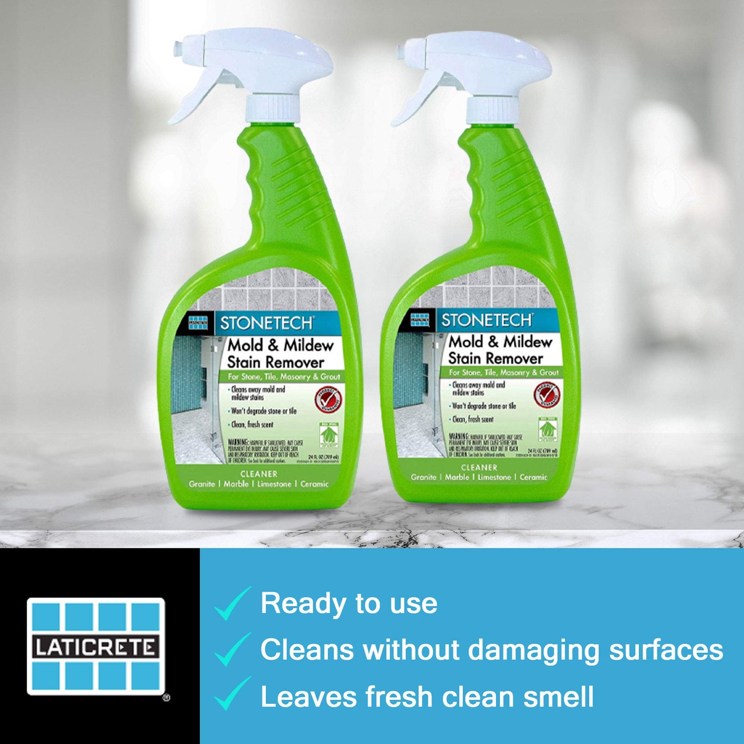 STONETECH Mold & Mildew Stain Remover is a ready-to-use, powerful specialty cleaner specifically formulated to remove mold, mildew and even algae on natural stone, tile, masonry and grout. It quickly dissolves unsightly mold and mildew stains without degrading or harming the surface. STONETECH Mold & Mildew Stain Remover features a foaming action sprayer that allows the cleaner to adhere well to vertical applications and avoid messy drips. Great for kitchen countertops, bathroom vanities, showers, patios and more.