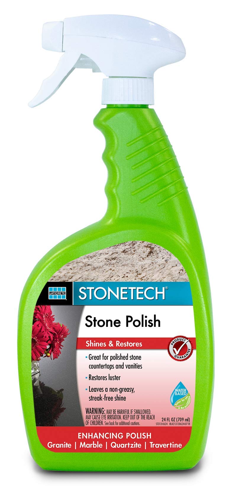 StoneTech Professional Polish adds a quick, brilliant shine to polished stone. It leaves no greasy film and is easy to use. Great for kitchen countertops and bathroom vanities. Use on: polished natural stone such as marble, granite, limestone & travertine. NOT FOR USE ON FLOORS, MAY CREATE SLIPPING HAZARD. Use only as directed. Always test in a small inconspicuous area to determine that the desired results will be achieved. Make sure surface is clean, dry and free of waxes and coatings.